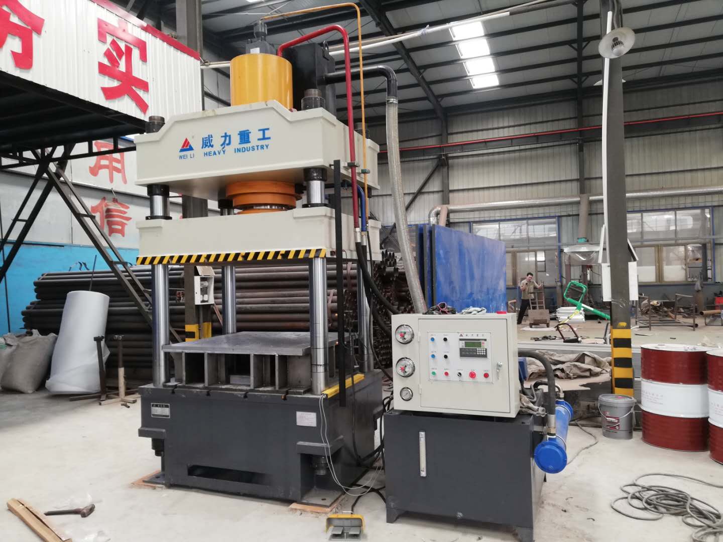 【產品描述】:本液壓機用于不銹鋼餐盤的壓制成型,把不銹鋼板材放置在液壓機餐盤模具上,液壓機運動上下壓制,液壓機下壓保壓后,餐盤壓制成型,還可以用于不銹鋼水槽、不銹鋼盆、不銹鋼鍋的成型以及其他不銹鋼產品的壓制成型。山東威力重工機床有限公司可根據模具、拉伸變形量、不銹鋼板厚度,推薦選用200噸、315噸、400噸、500噸的四柱液壓機來完成一次拉伸成型工藝,可根據客戶